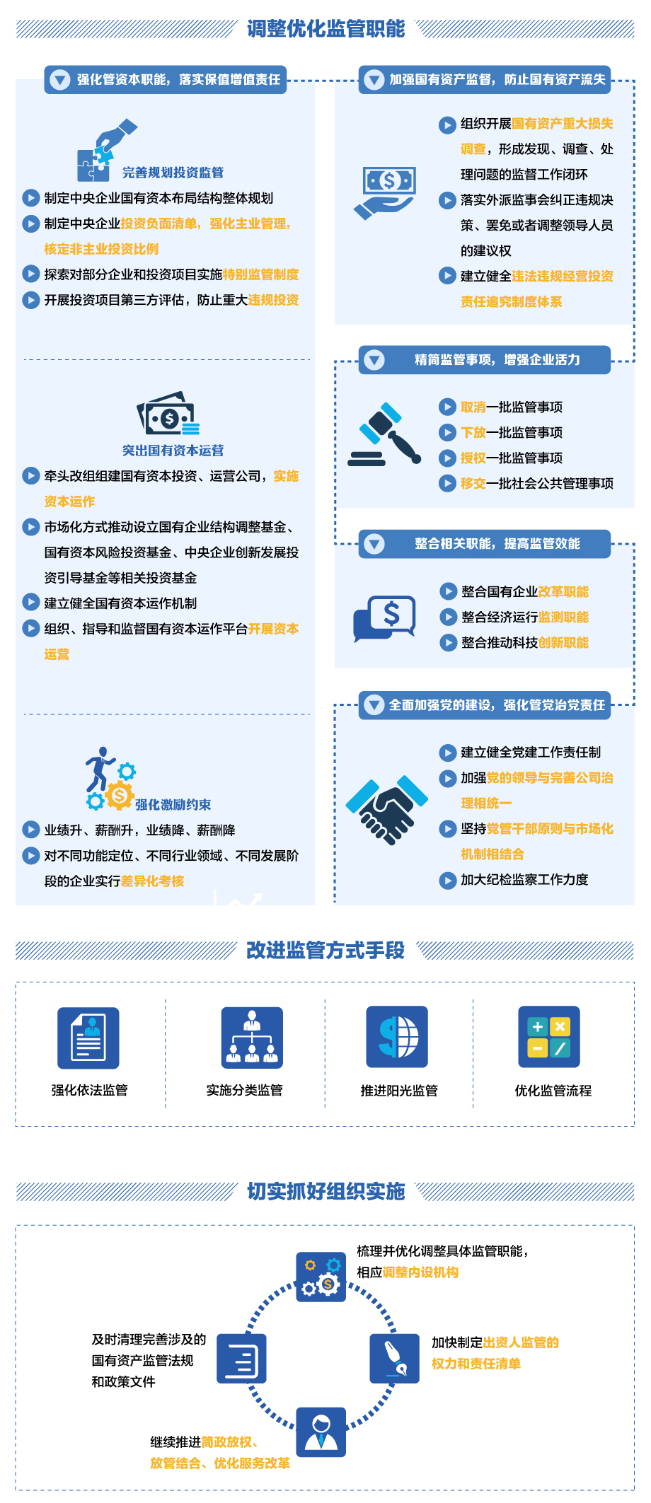 | 党的十八大以来,,,,,国务院国资委认真贯彻落实党中央、国务院关于深化国有企业刷新的决议安排,,,,,准确掌握国有资产羁系机构的出资人代表职责定位,,,,,坚定不移深化国有企业刷新,,,,,探索完善国有资产羁系体制机制,,,,,起劲推进国有企业结构调解、立异生长,,,,,为实现国有资产保值增值、避免国有资产流失、生长壮大国有经济作出了起劲孝顺。。。。。但与此同时,,,,,国有资产监视机制尚不健全,,,,,国有资产羁系中越位、缺位、错位问题依然保存,,,,,亟需加速调解优化羁系职能和方法,,,,,推进国有资产羁系机构职能转变,,,,,进一步提高国有资源运营和设置效率。。。。。4月27日,,,,,国务院办公厅转发《国务院国资委以管资源为主推进职能转变计划》,,,,,明确提出调解优化国资羁系职能,,,,,刷新羁系方法手段,,,,,着力提高国有资源效率,,,,,增强国有企业活力。。。。。文件还明确了精简的国资羁系事项共43项。。。。。 |