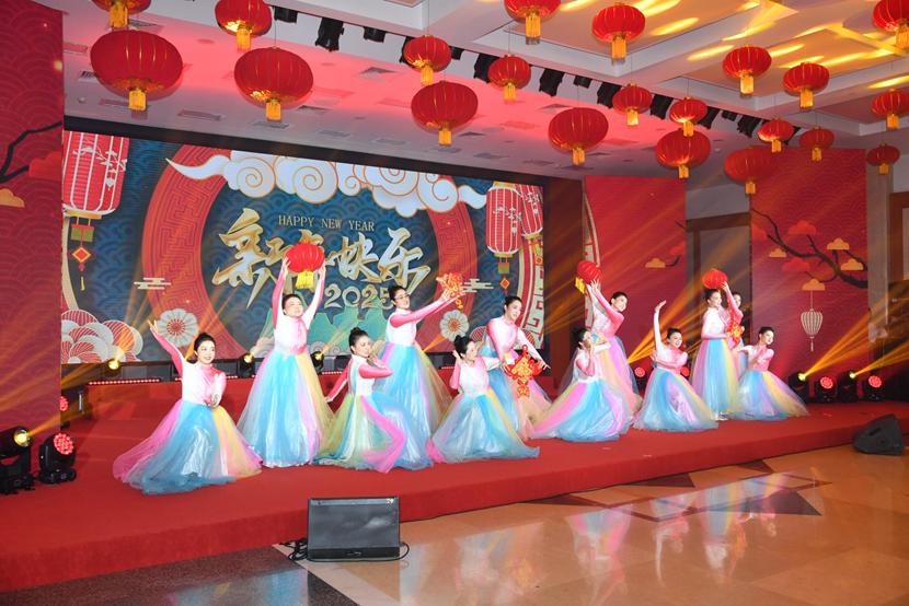 团拜会上欢声笑语回荡,,,,,,,干部职工自编自演的舞蹈、歌曲、情景剧、国风展示等节目精彩纷呈,,,,,,,充分展现了宽大干部职工为国资央企事业拼搏贡献的精神风貌,,,,,,,赢得了阵阵热烈掌声,,,,,,,会场充满了欢喜、祥和、喜庆的节日气氛。。。。。。。。最后,,,,,,,各人齐声高唱《中国 中国 鲜红的太阳永不落》,,,,,,,将气氛推向热潮。。。。。。。。