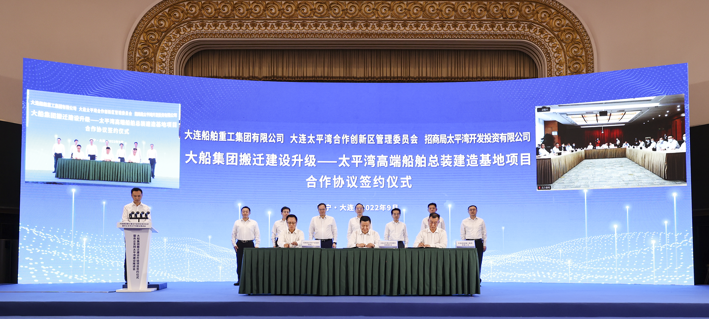 9月24日,,,,,,,,大船集团搬家建设升级项目签约仪式暨央企支持太平湾建设推进会在北京、大连以视频连线方法举行。。。。。。国资委党委委员、副主任翁杰明出席并讲话。。。。。。辽宁省委副书记、省长李乐成、大连市主要认真同志出席聚会。。。。。。