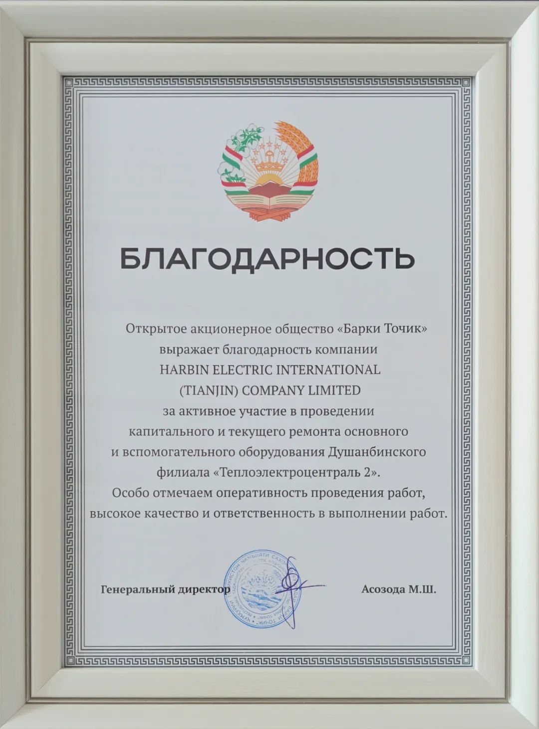 克日,,,,,,,18新利国际收到塔吉克斯坦共和国电力公司发来的谢谢信,,,,,,,对18新利国际在杜尚别2号电厂磨练事情中展现的专业能力与责任继续给予高度评价。。。。。