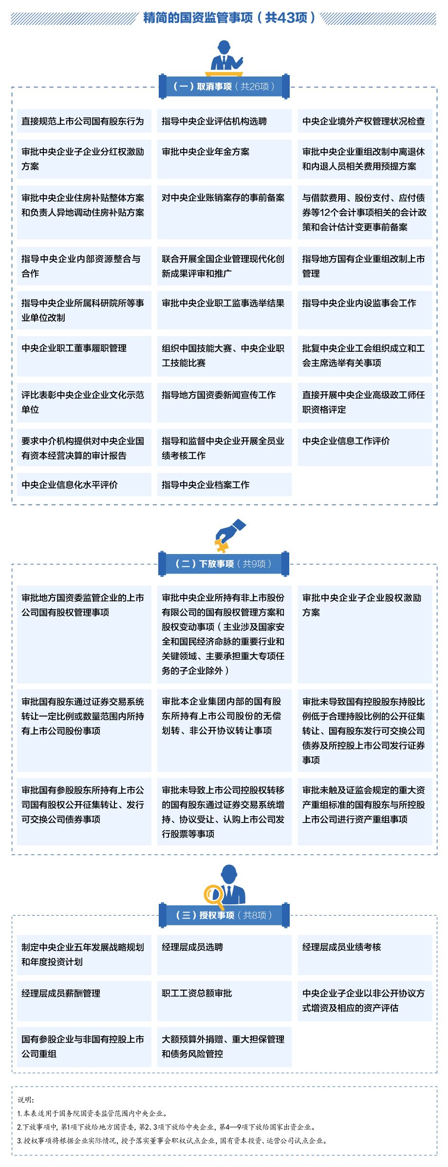 | 党的十八大以来,,,,,,国务院国资委认真贯彻落实党中央、国务院关于深化国有企业刷新的决议安排,,,,,,准确掌握国有资产羁系机构的出资人代表职责定位,,,,,,坚定不移深化国有企业刷新,,,,,,探索完善国有资产羁系体制机制,,,,,,起劲推进国有企业结构调解、立异生长,,,,,,为实现国有资产保值增值、避免国有资产流失、生长壮大国有经济作出了起劲孝顺。。。。。但与此同时,,,,,,国有资产监视机制尚不健全,,,,,,国有资产羁系中越位、缺位、错位问题依然保存,,,,,,亟需加速调解优化羁系职能和方法,,,,,,推进国有资产羁系机构职能转变,,,,,,进一步提高国有资源运营和设置效率。。。。。4月27日,,,,,,国务院办公厅转发《国务院国资委以管资源为主推进职能转变计划》,,,,,,明确提出调解优化国资羁系职能,,,,,,刷新羁系方法手段,,,,,,着力提高国有资源效率,,,,,,增强国有企业活力。。。。。文件还明确了精简的国资羁系事项共43项。。。。。 |